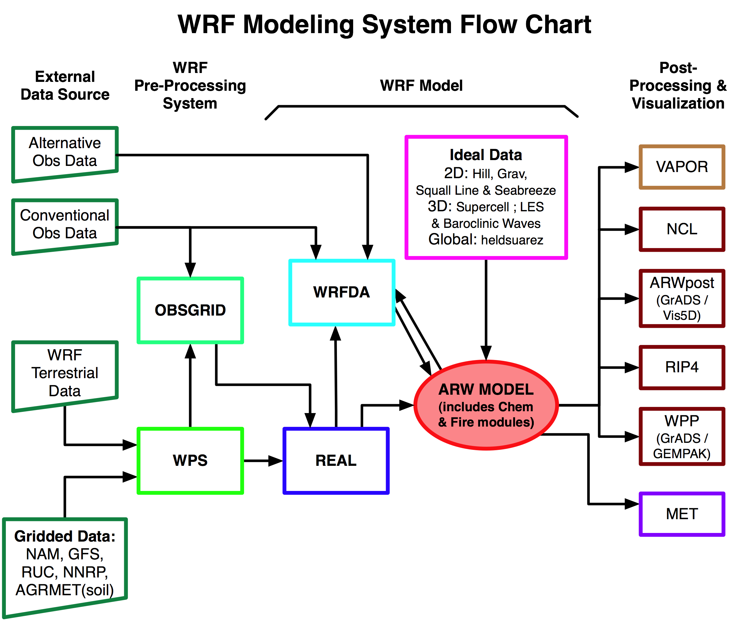 - 对于实际场景运行: WPS + WRF-ARW Solver + PostProcessing