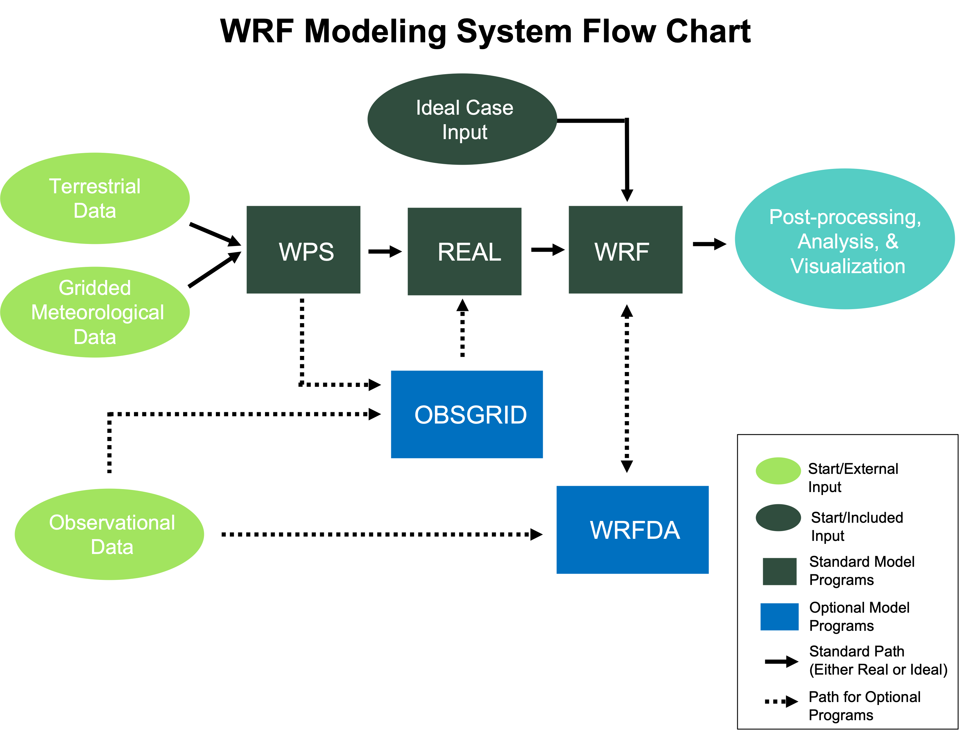 - 对于实际场景且需要变分分析: WPS + WRFDA + WRF ARW Model + Postprocessing